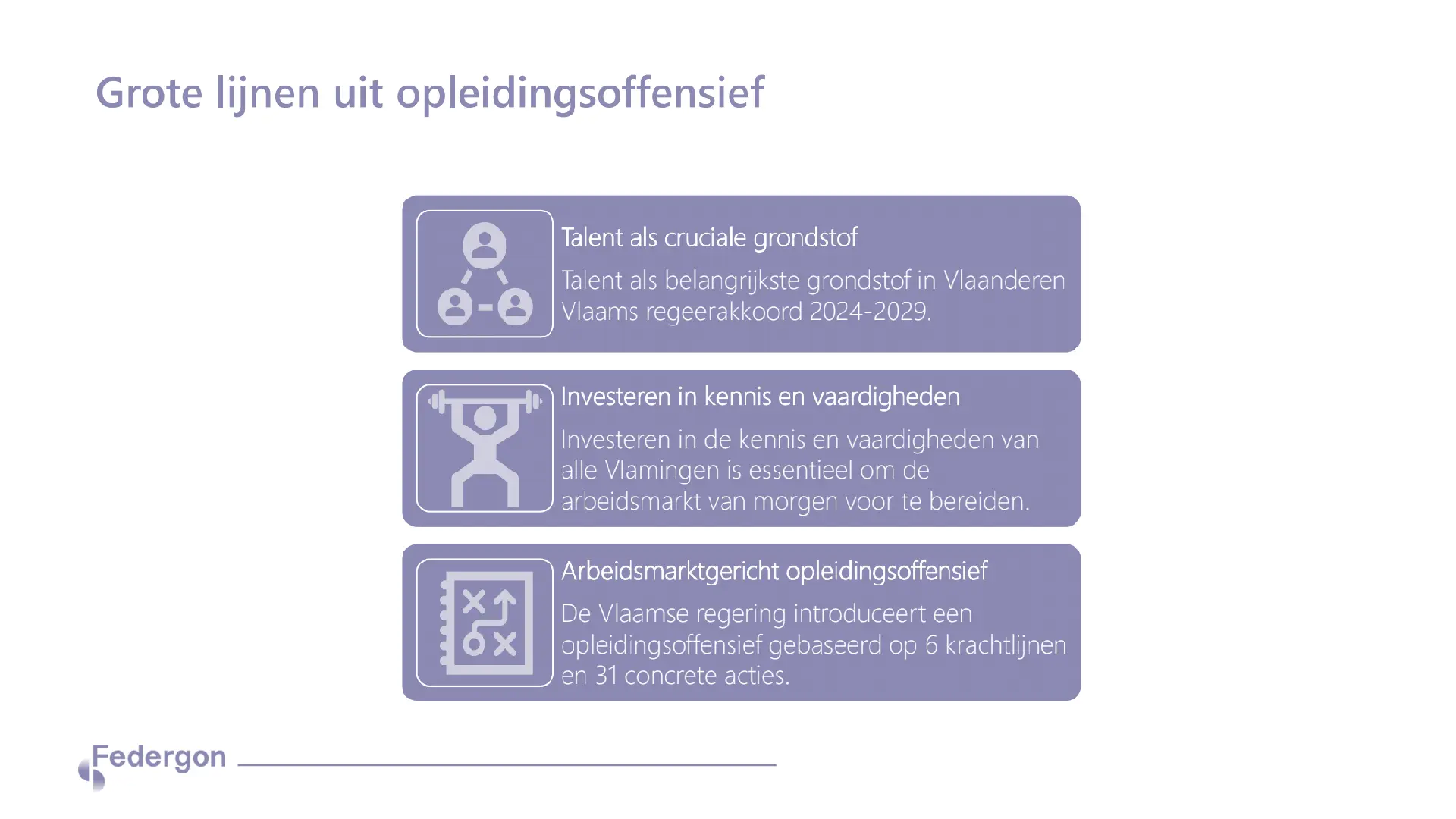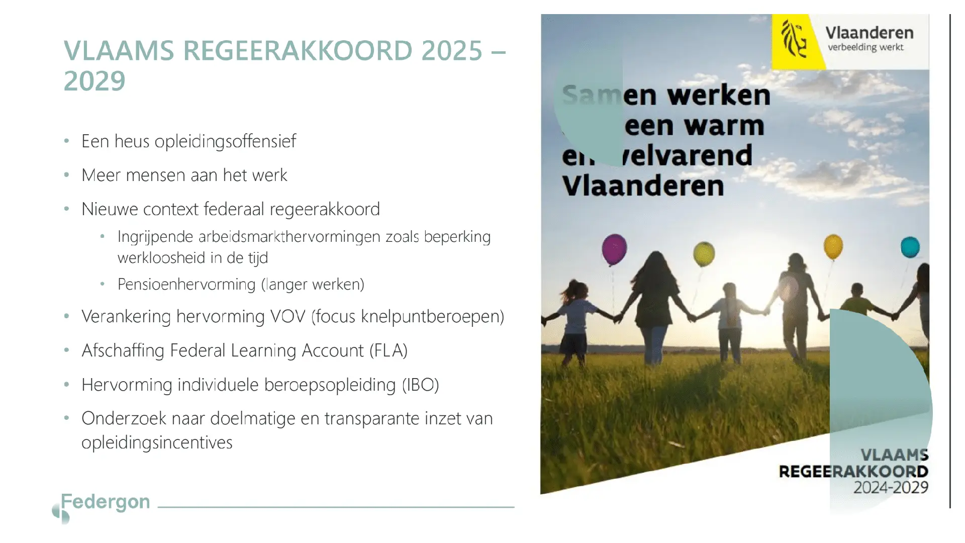 In het Vlaams regeerakkoord van oktober 2024 werd het Vlaams Opleidingsoffensief aangekondigd, met nadruk op meer mensen aan het werk krijgen. Op de afbeelding hieronder vind je de hoofdpunten uit dat regeerakkoord terug.