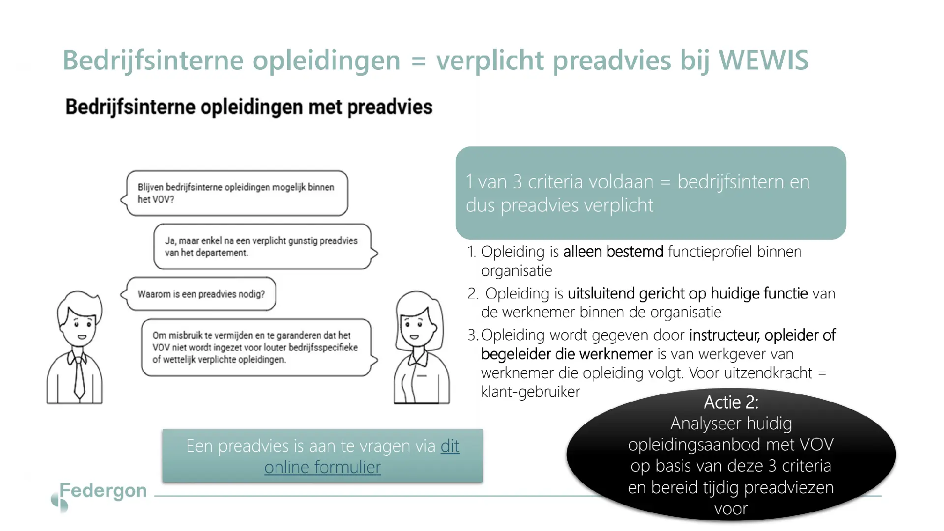 - Om VOV in te zetten voor bedrijfsinterne opleidingen moet je verplicht preadvies aanvragen bij WEWIS, want de opleidingen moeten aan bepaalde criteria voldoen (zie afbeelding hieronder). Analyseer dus je huidig opleidingsaanbod met VOV goed en bereid je preadvies tijdig voor. Preadvies aanvragen kan via dit formulier.