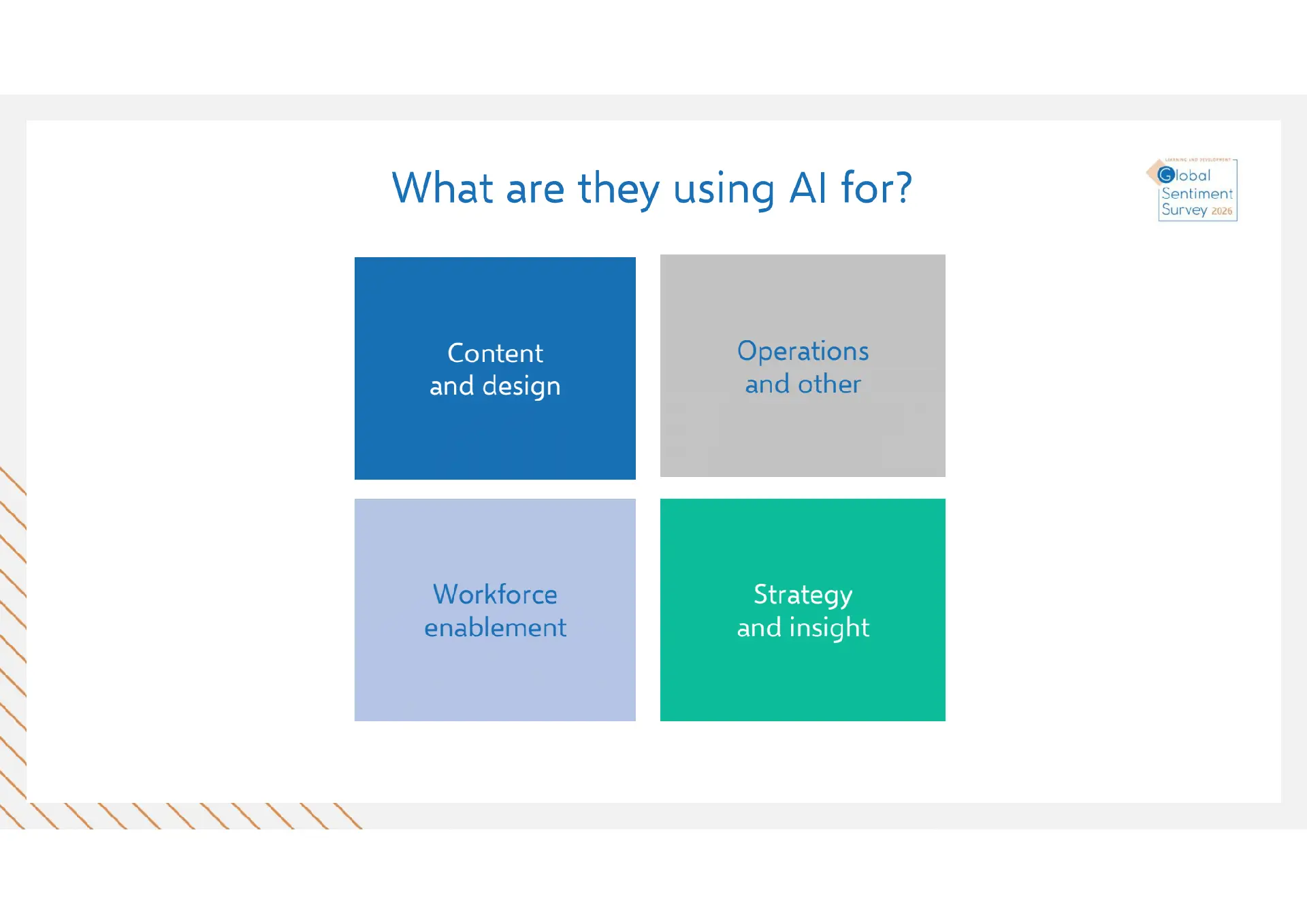 Uit deze resultaten concludeert Donald dat vooral de interesse van L&D in AI nog steeds zeer groot is. Bovendien gebruiken we het steeds vaker in ons werk, maar selectief. Egle Vinauskaite, co-auteur van de L&D Global Sentiment Survey, schreef een rapport over het gebruik van AI in L&D, gebaseerd op de resultaten uit de survey. Hierin kunnen we lezen dat we het punt van experimenteren voorbij zijn. Wereldwijd wordt Artificiële Intelligentie nu gebruikt in 4 domeinen binnen L&D (zie afbeelding hieronder), met content & design voorop, gevolgd door workforce enablement (wat vooral met skills te maken heeft, verheldert Donald in het webinar). Wat nog opvalt, is dat we AI ook meer gebruiken voor analyse, data en research dan voordien.