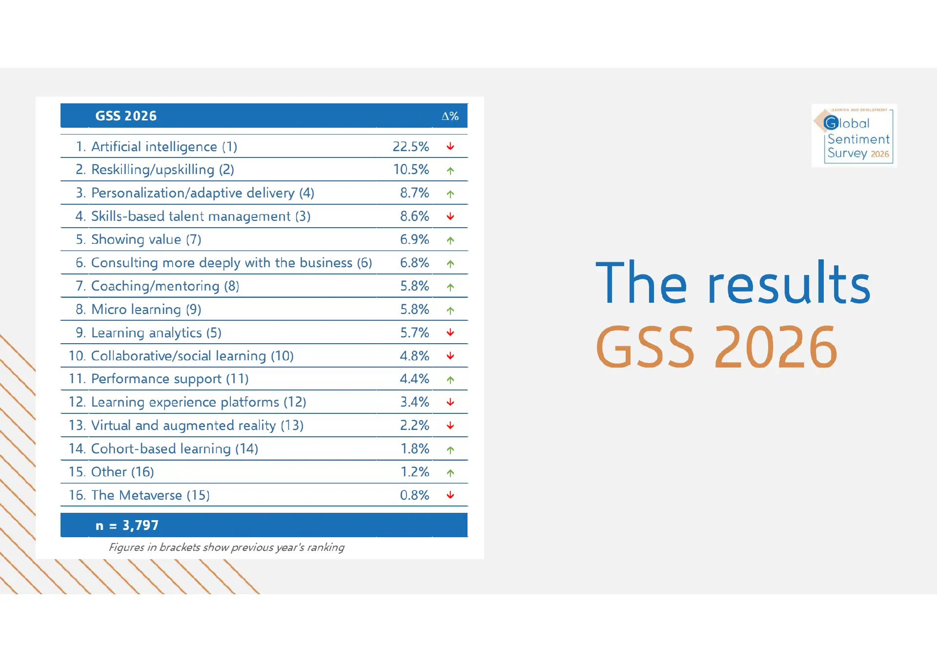 Donald trapt het webinar af met een opvallende quote: deze editie van de GSS is de belangrijkste ooit, want L&D staat op een kantelpunt en dat geven de resultaten van de survey ook weer. Natuurlijk zit de opkomst van Artificiële Intelligentie en Large Language Models zoals ChatGPT daar voor iets tussen. Waar we eind 2022 vooral overvallen werden door de razendsnelle opkomst en evolutie van generatieve AI, begrijpen en gebruiken we anno 2026 Artificiële Intelligentie beter, zegt Donald. Al blijven we ook bang voor wat er allemaal aan het gebeuren en veranderen is.