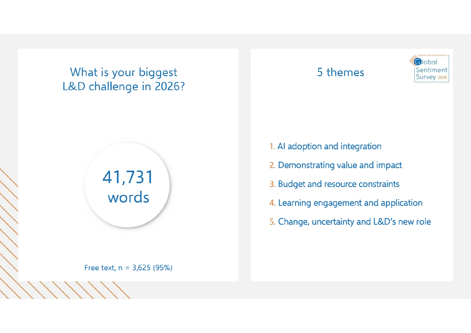 In de L&D Global Sentiment Survey peilt Donald Taylor naar 3 zaken bij L&D-professionals: wat wordt er volgens jou ‘hot’ in L&D in 2026, wat is jouw grootste L&D-uitdaging en wat deed je de afgelopen 12 maanden anders dan vroeger? Het is niet verrassend dat AI met stip op 1 staat in de lijst met ‘hot topics’ waaruit deelnemers aan de survey kunnen kiezen.