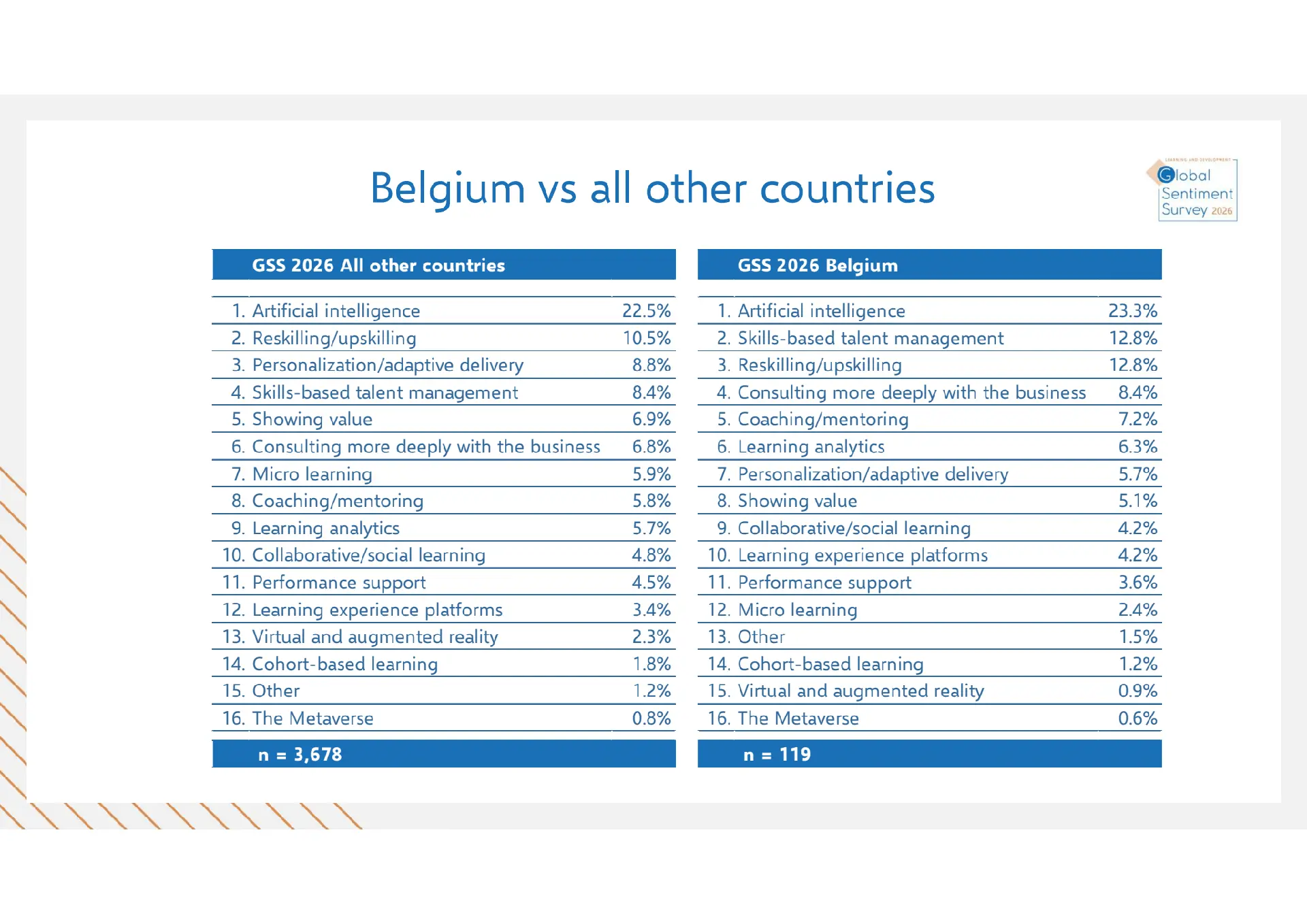 Vervolgens zoomt Donald Taylor in op de resultaten uit België. Belangrijk om te weten: de deelnemers aan de survey wereldwijd werken voornamelijk in kleine bedrijven (10 - 49 werknemers). In België namen vooral werknemers bij grote bedrijven in de publieke sector (+1000 werknemers) deel aan de GSS26. Dit is belangrijk omdat de antwoorden verschillen tussen grote en kleine organisaties, benadrukt Donald. Kleine organisaties zijn vaker geïnteresseerd in onderwerpen als microlearning, terwijl grote organisaties doorgaans meer interesse hebben in learning analytics, bijvoorbeeld. Daarom verschillen de antwoorden uit België wellicht ook met de algemene resultaten.