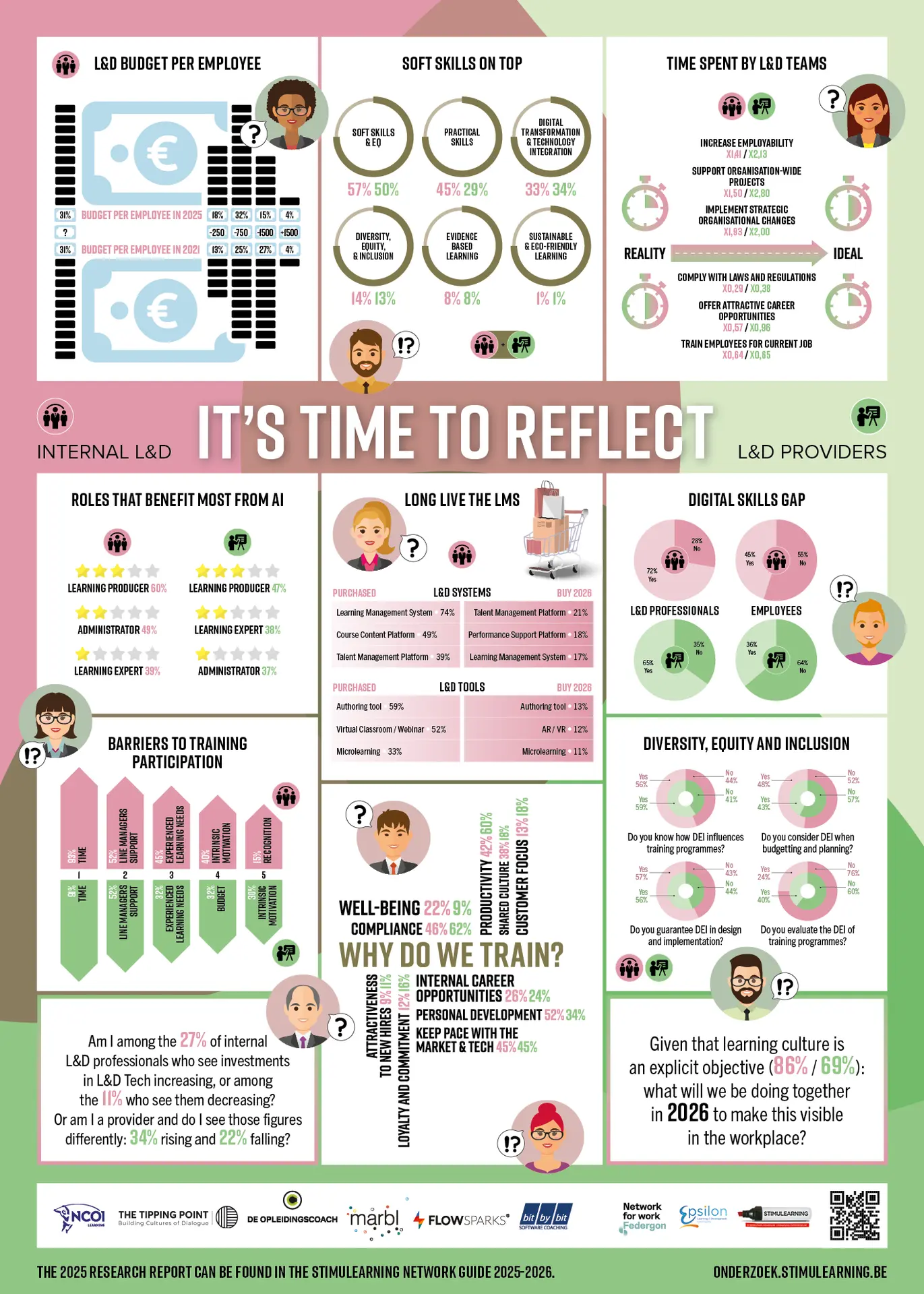 Het rapport toont ook dat L&D meer strategisch wil werken, maar Leen en Alain plaatsen daarbij een kanttekening: “In deze economische realiteit moet je soms ook reactief durven handelen. Pas je ambitie aan de maturiteit van de organisatie aan. Niet elke context vraagt een groot beleidsplan of uitgebreid aanbod. Soms vraagt ze klare actie rond urgente uitdagingen als inzetbaarheid en performantie.”